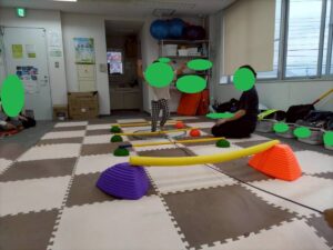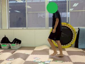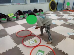 黄色いポールジャンプしながらフラフープの中に入ってゴールするよ。黄色いポール高くして、よりジャンプ力が必要です。🏃