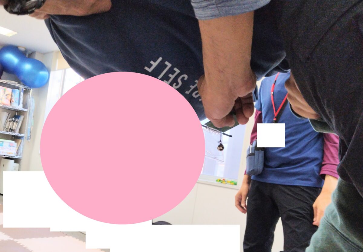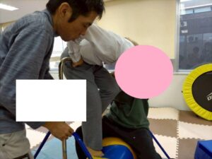 行う動きはこちらの「布団」のポーズ!頭を下に下げる恐怖心をなくせるように補助しています!怖い気持ちがあるときは、跳び箱を踏み台にして頭を下げられるようにしています。