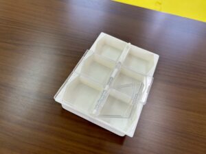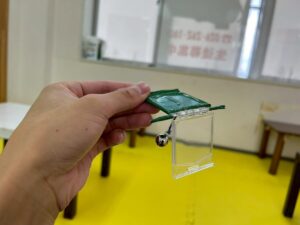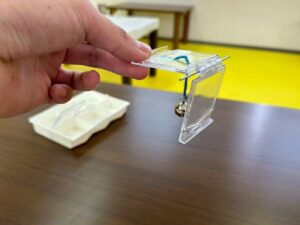 こちらの道具です!息を吹きかけると、プラスチックの板が揺れて鈴にぶつかり音が鳴るという仕組みです!