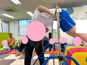 静かな活動に入る前に、鉄棒をやった筋肉をほぐすためスタッフがストレッチをしてくれました!