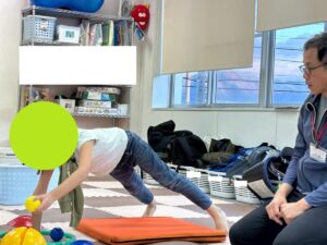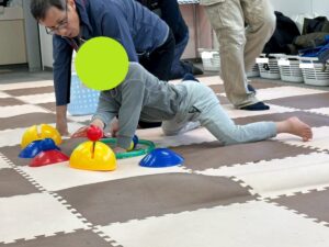 クマの姿勢で、ボールを集め、同じ色のマーカーコーンに乗せる運動ですが、クマの姿勢!と言われてもイメージがつかないお子さんもいます🐻
