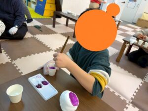午後は紙粘土でだるまさん作りです。普段の油粘土と違うので皆さん物珍しい感じがいる人もいました。だるまさんの形にする→紙粘土乾かす→色塗り→顔書き😁出来上がり✌🏻