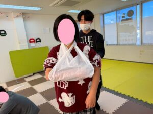 ↑ ポリ袋を使って臨時の三角巾。腕が折れてしまった時に応急処置!