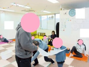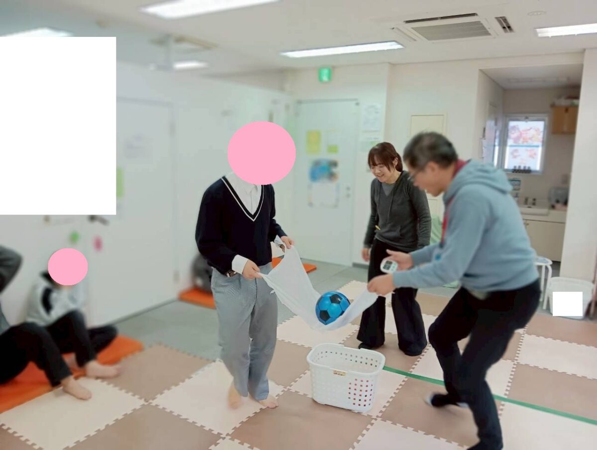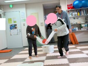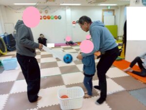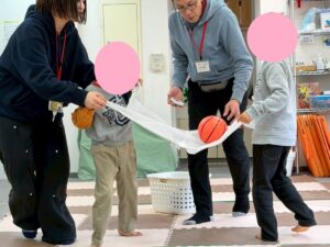 体幹に課題があると面立ちも、しっかり集中して腕を安定させて、ボールから目を離さずに自分たちで運ぶことが出来ました!ボールをかごに入れる時も、手をつかわないでおこないます!