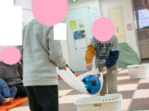 今週の運動遊びは、ビニール袋を使ったボール運びを行っています!