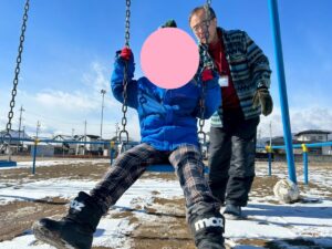 お次はブランコへ。最初はスタッフに押してもらうだけでしたが、隣でスタッフがお手本を見せながら、「足を曲げて、、のばしてー」と声掛けすると、上手にマネして足で漕ぐことができていました!そのうちスタッフがすごい高さになり、面白がってけらけら笑っていました🤭