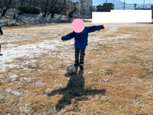 サッカーもしました!ボールに足を当てるのが上手で、「学校でもやってるよー」と教えてくれた通り、キックも力強かったです!