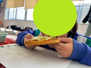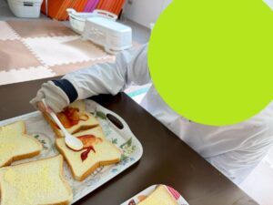 チーズをくり抜いて文字を作るという工夫をするお友達もいて、それぞれ個性があふれたトッピングで素敵なピザトーストが完成しました!
