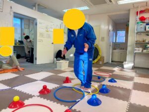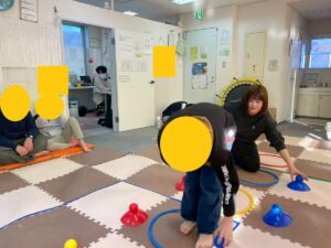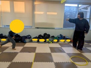 運動遊びの様子です!!スタートからジャンプをし、青のカップの時は青いボールを入れ、赤いカップの時は、赤いボール🥎をフープの中に入れていきます!みなさんジャンプ🏃♂️しながらスイスイと素早くできていましたよ✨ 今日は新しい運動遊びで、ワクワクしながら気合が入っていました😁👍🏻