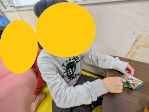 今日は静かな活動では・・・ 今日のフラッシュカードは「天然記念物」でしたが、難しかったようで😯答えるのに皆さん一生懸命でした!読み聞かせは、「ムシてつ」という題名の絵本でした📖 電車が大好きなお友達が多いので集中して聞いていましたよ。終った後は「読み聞かせ楽しかったーー!」と好評でした。😁