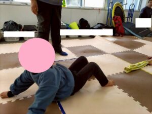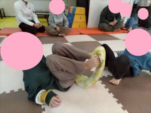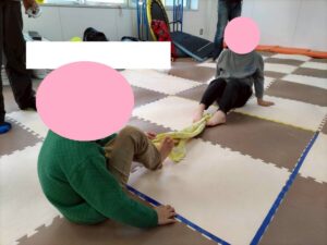 今週の運動あそびでは足と腹筋を使った綱引きを行っています!