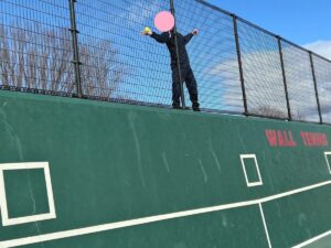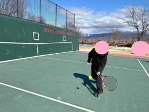 そして、今日は元テニス部だったスタッフが持ってきたラケットで初めての壁打ちに挑戦!!