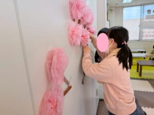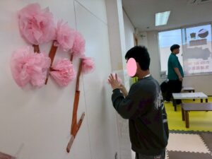ひふみ稲葉教室では、桜の壁画作りをしよう!ということになり、児童もスタッフもみんなで一生懸命です。稲葉教室に来て日の浅いk先生は知らなかったのですが、毎年の恒例ならしです!3月といえば卒業のシーズンなので桜の壁飾りはとても似合ってていいですよね(^^♪