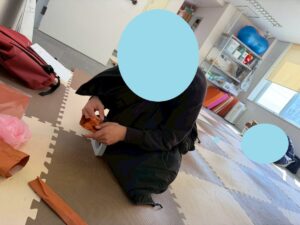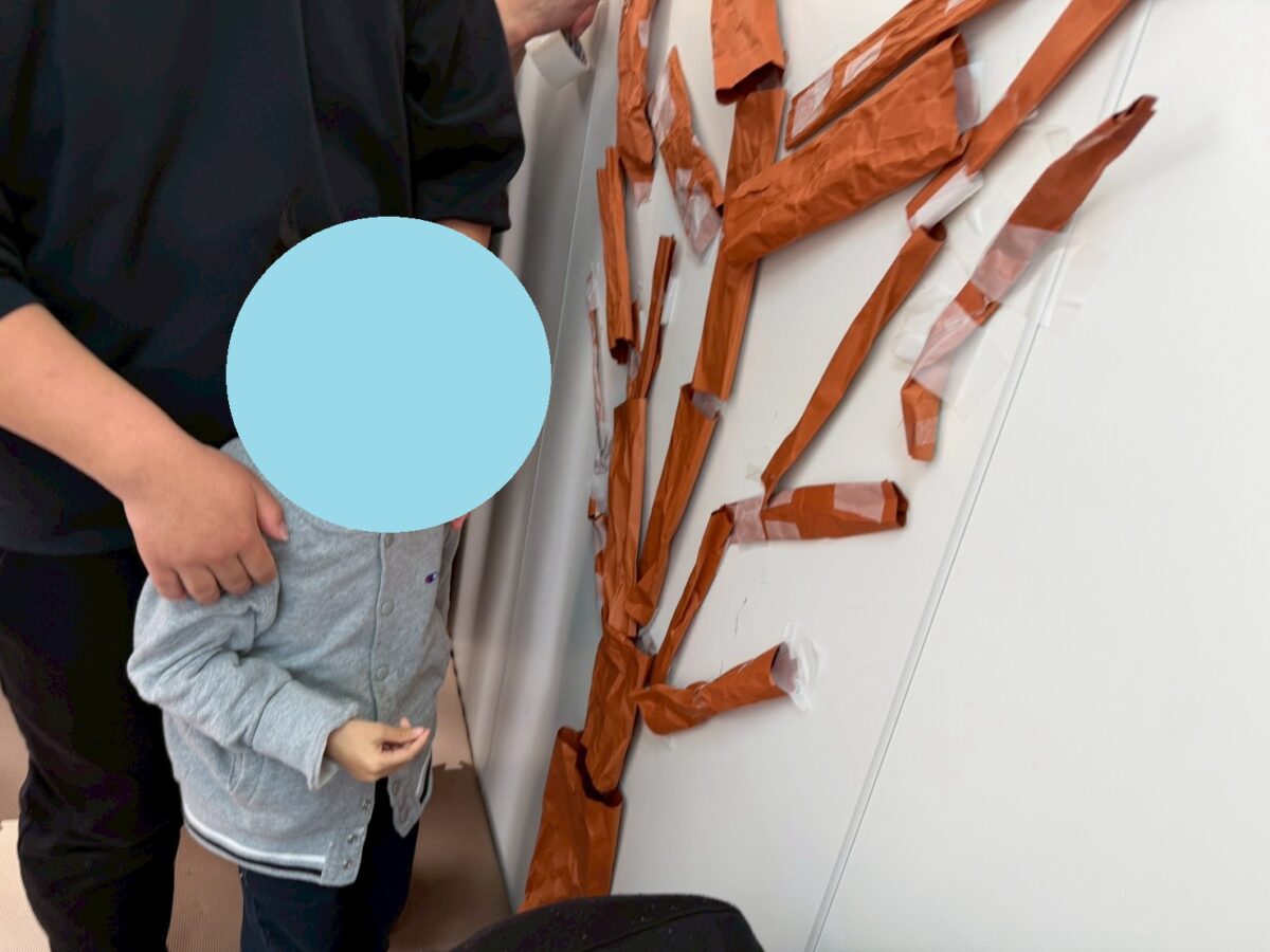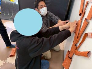 立体的になった木の幹をみんな一人一人壁に貼り付けていきます。作ってくれたお友達から、順番に貼る場所を考えて貼ってもらいました!!