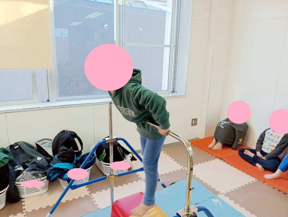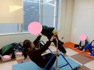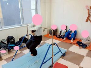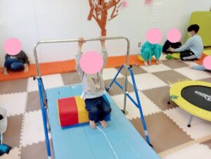 スズメポーズが難しいお友達は、ぶら下がったり丸まったりして、別のアプローチで運動をしています!