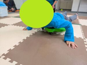 一番💦(;’∀’)をかきながら頑張ったのはスクターボードです。体勢は、結構楽に感じられますが、手✋の力だけで押さなくてはいけないため難しいですけど、頑張っていました。