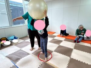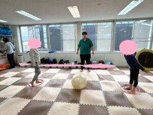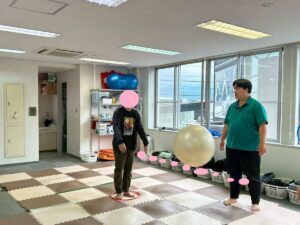 2種目目は、バランスボールでのキャッチボール!二人のちょうど真ん中を狙ってボールを投げ、相手が取りやすい力加減や位置を目指します!