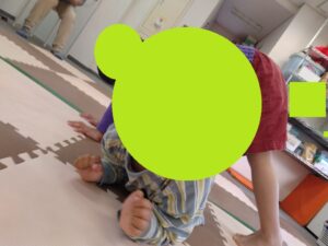 次も二人一組ペアでのトンネルリレーもお友達同士上手に出来ています。身体の大きさがあまりにの違うとトンネルくぐる時大変でしたね。でも身体の大きいお友達もトンネルをくぐる際なるべくマットに身体をつけて前に進んだら上手にトンネルくぐりができました。