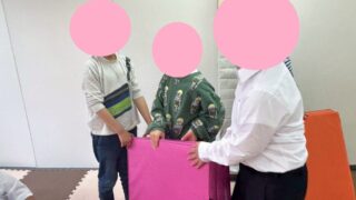 運動あそびの準備や後片付けは、参加するお友達みんなで仲良く行います!! 以前は「このマットは僕がもっていくーー!!」など喧嘩が起こることもありましたが、皆で仲良く協力して持っていくことが定着してきて、お友達とペースを合わせて持っていけるよう...